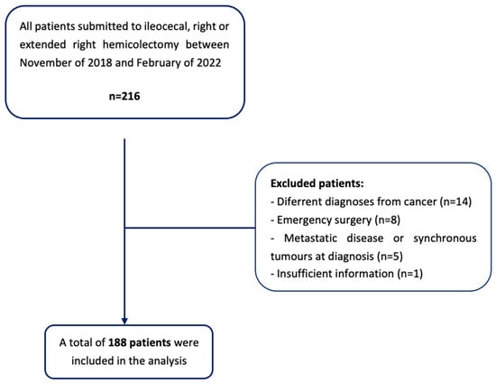 Variables related to patient demographic data (gender, age, and body mass index); presence of comorbidities, such as HTN, DM, or chronic obstructive pulmonary disease (COPD); American Society of Anesthesiology (ASA) score; smoking habits; pre-operatory data; value of hemoglobin, glucose, albumin, and serum protein levels; carcinoembryonic antigen (CEA) and carbohydrate antigen 19.9 (CA 19.9); preoperative blood transfusions; intra-operatory data; surgical procedures (such as ileocecal resection, right colectomy, and extended right colectomy; open vs. laparoscopic approach; surgical anastomosis performed, such as hand-sewn vs. stapled; side to side Vs, end to side; intra vs. extracorporeal; iso vs. anisoperistaltic; reinforcement of sutures; duration of surgery; intraoperative complication or unplanned event/finding and blood transfusions); and postoperative data, including value of hemoglobin, C-reactive protein (CRP), albumin and serum protein levels; blood transfusions; tumor location; and cancer staging were collected retrospectively.