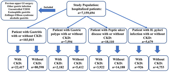 Sample selection and study design flowchart. A total of 7,159,694 hospitalized patients were analyzed and selected based on ICD-10 and exclusion criteria. The sample included patients diagnosed with gastritis, gastric polyps, peptic ulcer disease, and H. pylori infection. The following numbers represent the sample size of patients with each condition, categorized by the presence or absence of CKD.