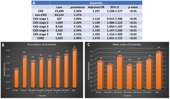 Prevalence and odds ratio for patients with CKD with gastritis. (A) The case number, prevalence, and adjusted odds ratio for gastritis in patients with diagnosis of different stages of CKD. (B) Bar graph for prevalence of gastritis in patients without CKD, patients with CKD, and different stages of CKD. (C) Bar graph presents adjusted odds ratio of gastritis in patients with different stages of CKD. CKD, chronic kidney disease; OR, odds ratio; ESRD, end-stage renal disease, ** p < 0.01. Adjusted for age, gender, race, obesity, smoking history, T2DM, hypertension, and hyperlipidemia.