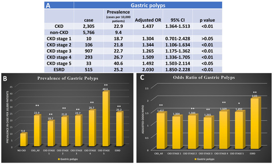 Patients with CKD were more likely to develop gastric polyps compared to those without CKD (OR: 1.437 95%CI: 1.364–1.513, p < 0.001), with a prevalence of 22.9 per 10,000 cases among those with CKD and 9.4 per 10,000 cases among patients without CKD (p < 0.01). The odds of gastric polyps also had a positive association with the stage of CKD, similar to gastritis (CKD stage 2: 1.344, 95%CI: 1.106–1.634 VS ESRD: 2.030, 95%CI: 1.850–2.228, p < 0.01) (Figure 3).