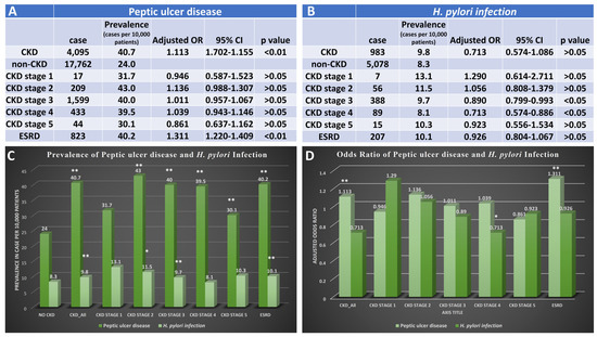 Prevalence and odds ratio for patients with CKD with peptic ulcer disease and H. pylori infection. (A) The case number, prevalence, and adjusted odds ratio for peptic ulcer disease in patients with diagnosis of different stages of CKD. (B) The case number, prevalence, and adjusted odds ratio for H. pylori infection in patients with diagnosis of different stages of CKD. (C) Bar graph for prevalence of peptic ulcer disease or H. pylori infection in patients without CKD, patients with CKD, and different stages of CKD. (D) Bar graph presents an adjusted odds ratio of peptic ulcer disease or H. pylori infection in patients with different stages of CKD. CKD, chronic kidney disease; OR, odds ratio; ESRD, end-stage renal disease, * p < 0.05, and ** p < 0.01. Adjusted for age, gender, race, obesity, smoking history, T2DM, hypertension, and hyperlipidemia.