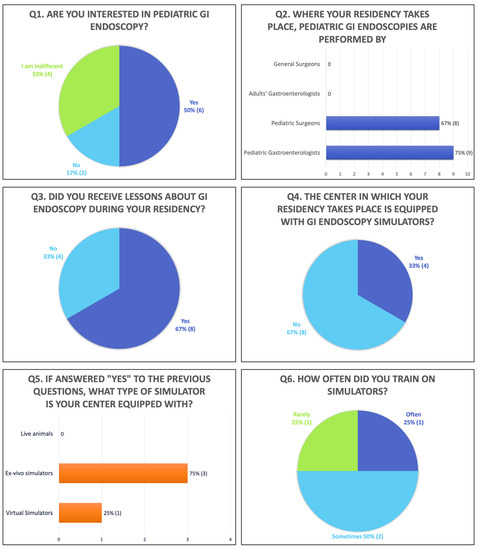 First, not all trainees had the opportunity to observe GI endoscopies: indeed, 17% were attending residency in a place in which digestive endoscopic procedures were performed by gastroenterologists. As a matter of fact, our questionnaire shows a slight prevalence of pediatric gastroenterologists (75%) over pediatric surgeons (67%) in performing GI endoscopy in Italy (Figure 1 Q2, Figure 2 Q7, Q8).