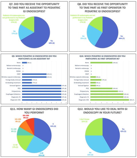 As regards the possibility of participating in GI endoscopic procedures (Figure 2 Q7, Q8), 17% (2/12) working in a center in which GI endoscopy is performed exclusively by pediatric gastroenterologists had never observed one, 68% (8/12) had assisted his/her consultant, and 58% (7/12) had performed pediatric GI endoscopies himself/herself (Figure 2 Q9, Q10 presents the details about the procedures performed as first and second operators).