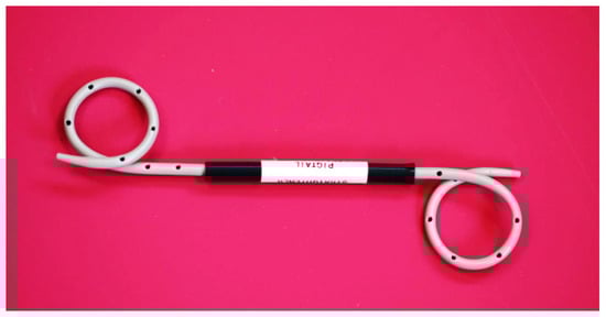 - Yzet, C.; Hakim, S.; Pioche, M.; Le Mouel, J.P.; Deschepper, C.; Lafeuille, P.; Delcenserie, R.; Yzet, T.; Nguyen-Khac, E.; Fumery, M.; et al. Endoscopic treatment of large gastric leaks after gastrectomy using the combination of double pigtail drains crossing a covered stent. Surg. Endosc. 2022, 36, 9469–9475. [Google Scholar] [CrossRef]