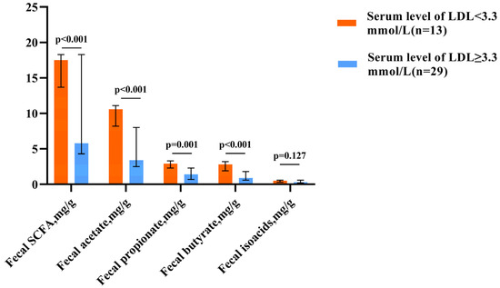 Hypercholesterolemia, which is defined as an LDL level above 3.3 mmol/L [17], was found in all patients with decreased fecal SCFA levels and only in 37.9% of patients with elevated levels (p < 0.001). Patients with hypercholesterolemia had lower SCFA levels than those of patients without this pathology (Figure 1).