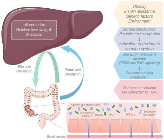 Several studies have suggested that abnormalities in the composition of the gut microbiota play an essential role in the development and progression of MAFLD. The involvement of several mechanisms has been discussed. The first is the modulation of bile acid synthesis, which is critical for fat absorption and affects glucose metabolism through the farnesoid X receptor [8]. The second is the activation of the innate immune system due to the translocation of bacterial components [1,2,3,4,5,6]. The third is the production of endogenous ethanol [2,8]; reduced choline metabolism alters very low-density lipoprotein metabolism and promotes inflammation [3,4,7]. Finally, there is a change in the production of short-chain fatty acids (SCFAs) [3,4,5,6,7,8,9].