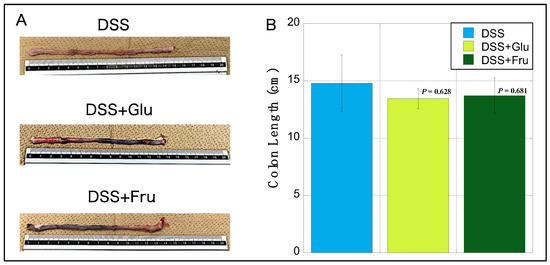Changes in the colon length of rats. (A), Representative images of colon tissues from the DSS, DSS + Glu, and DSS + Fru groups. (B), The y-axis represents the colon length (in cm) of rats in the DSS (light blue square), DSS + Glu (light green square), and DSS + Fru (dark green square) groups. Data values are presented as the mean ± standard. Each p-value in the figure: DSS group vs. other groups. DSS, dextran sulfate sodium; DSS group, DSS-induced experimental colitis rats fed AIN-93G; DSS + Glu group, DSS-induced experimental colitis rats fed a glucose-excessive diet; DSS + Fru group, DSS-induced experimental colitis rats fed a fructose-excessive diet.