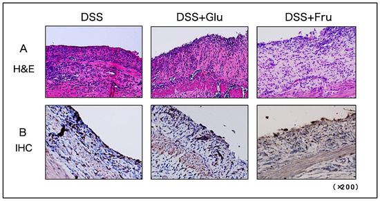 Histological assessment of colonic tissues of rats. (A) Microscopic H&E-stained images of colon tissues. (B) Microscopic IHC-stained images for detecting neutrophils in colon tissues. The panels present representative images of DSS, DSS + Glu, and DSS + Fru groups from left to right. All microscopic images were observed using a BIOREVO BZ-9000 microscope (Keyence Co., Ltd., Osaka, Japan). High-power magnification was used for all panels (×200). H&E, hematoxylin and eosin; IHC, immunohistochemical; DSS, dextran sulfate sodium; DSS group, DSS-induced experimental colitis rats fed AIN-93G; DSS + Glu group, DSS-induced experimental colitis rats fed a glucose-excessive diet; DSS + Fru group, DSS-induced experimental colitis rats fed a fructose-excessive diet.