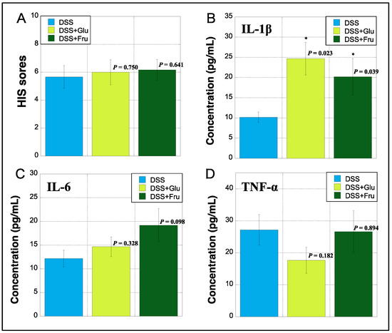 The HIS was assessed based on previously established criteria [22]. The HIS was slightly increased in the DSS + Fru group compared with that in the DSS and DSS + Glu groups (Figure 5A). The serum levels of IL-1β, IL-6, and TNF-α were measured using ELISA. The DSS + Glu and DSS + Fru groups had higher serum levels of IL-1β than the DSS group (Figure 5B). The serum levels of IL-6 were slightly higher in the DSS + Glu and DSS + Fru groups than those in the DSS group (Figure 5C). However, serum TNF-α levels tended to be lower in the DSS + Glu group than those in the other two groups (Figure 5D).