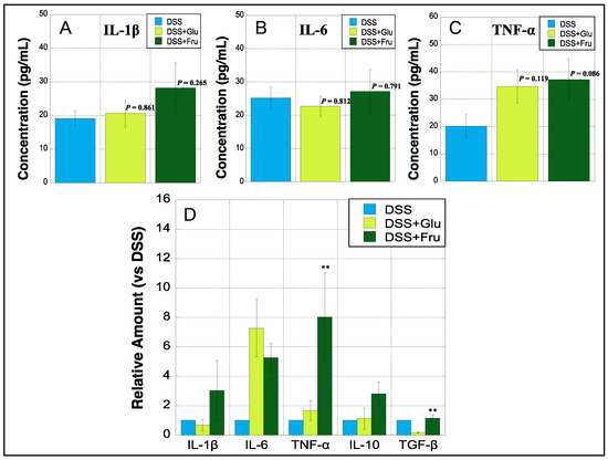 Colonic expression of cytokines at protein and genetic levels. (A–C), The y-axis represents the concentrations of IL-1β, IL-6, and TNF-α (pg/mL) in the colon of rats estimated using ELISA, respectively. (D), The y-axis represents mRNA expression levels of interleukin (IL)-1β, IL-6, tumor necrosis factor (TNF)-α, IL-10, and transforming growth factor (TGF)-β in the colon tissues of DSS + Glu and DSS + Fru groups versus those of the DSS group, as determined using real-time PCR. Data values are presented as the mean ± standard deviation (±SD). DSS group (light blue square), DSS + Glu group (light green square), DSS + Fru group (dark green square). Each p-value in the figure: DSS group vs. other groups. DSS, dextran sulfate sodium; DSS group, DSS-induced experimental colitis rats fed AIN-93G; DSS + Glu group, DSS-induced experimental colitis rats fed a glucose-excessive diet; DSS + Fru group, DSS-induced experimental colitis rats fed a fructose-excessive diet. ** p < 0.05 (DSS + Glu group vs. DSS + Fru group).