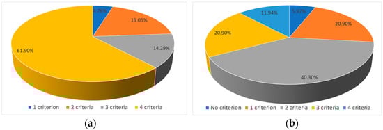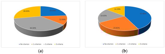 Number of criteria in gastric cancer patients (a) and in colorectal cancer patients (b).