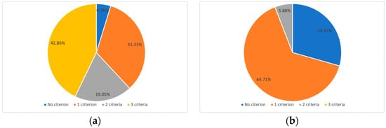 Using these criteria, there have been obtained that 13 out of the 21 gastric cancer patients (61.9%) have at least two criteria and 9 out of 21 (42.9%) have all three criteria, while for colorectal cancer patients, only 1 out of 17 (5.9%) have at least two criteria and no patient has all the three criteria. On the other side, only 1 out of 21 gastric cancer patients (4.8%) have no criteria, while 5 out of 17 (29.4%) have no criteria. These results are observed in Figure 2a (for gastric cancer patients) and Figure 2b (for colorectal cancer patients).