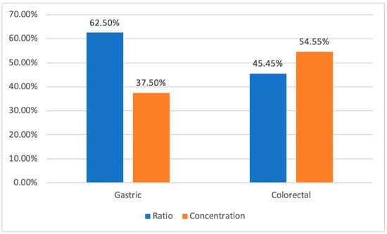 The main problem remains for the cases where there is only one criterion. In this case, are 33.3% of the gastric cancer patients and 64.7% of the colorectal cancer patients. For this situation, there is proposed the next classification of patients—the patients where the only criterion is a ratio and the ones where the only criterion is the whole blood maspin concentration. For 5 out of 8 gastric cancer patients (62.5%), the only criterion is a ratio, while for 6 out of 11 colorectal cancer patients (54.5%), the only criterion is whole blood maspin concentration < 100 pg/mL. These results are given in Figure 3.