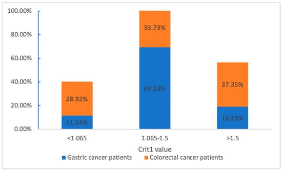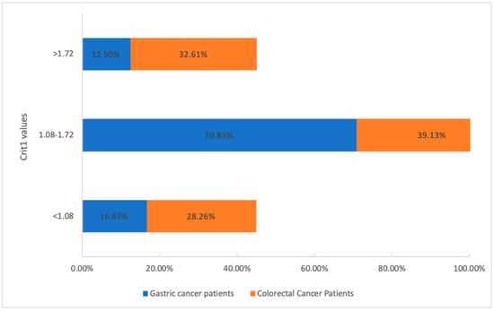 In contrast to the first two observations, most of the gastric cancer patients (75%) have a Crit1 value between 1.08 and 1.72, while only 39.13% of the colorectal cancer patients have the Crit1 value in this interval. In conclusion, a value for Crit1 between 1.08–1.72 is more characteristic of gastric cancer (Figure 6).
