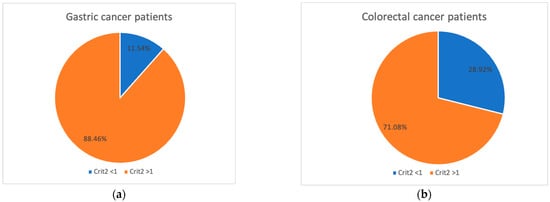 For Crit2 < 1, there are 28.92% of colorectal cancer patients while only 11.54% of gastric cancer patients, so a value of Crit2 less than 1 is more frequent in colorectal cancer patients than in gastric cancer ones. Most of the patients have values Crit2 > 1 for both locations (Figure 5a,b).