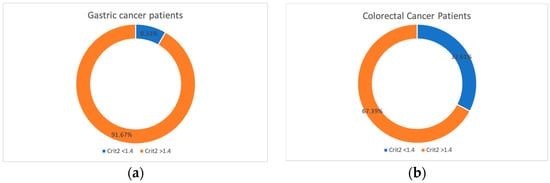 For Crit2 < 1.4, there are involved 30 out of the 92 colorectal cancer patients (32.61%) while only 2 out of the 24 gastric cancer patients (8.33%), so a value of Crit2 less than 1.4 is more frequent in colorectal cancer patients than in gastric cancer ones. Most of the patients have values Crit2 > 1.4 for both locations (Figure 7a,b).