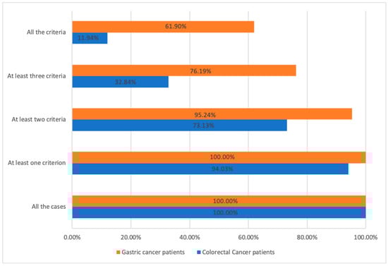 It can be observed that most gastric cancer patients have more criteria, while most colorectal cancer patients have fewer criteria. Starting from this observation, there have been analyzed the number of patients who respect at least a given number of criteria for each kind of cancer. It has been found that 100% of gastric cancer patients vs. 94.03% of colorectal cancer patients have at least one criterion, 95.24% of gastric cancer patients vs. 75.13% of colorectal cancer patients have at least two criteria, 76.19% of gastric cancer patients vs. 32.84% of colorectal cancer patients have at least three criteria and 61.9% of gastric cancer patients vs. 11.94% of colorectal cancer patients have all the four criteria as observed in Figure 9.