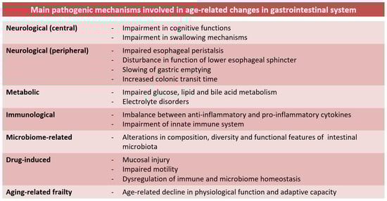Aging is associated with structural and functional alterations in the GI system due to different pathogenic mechanisms, as shown in Figure 1 [1,2,3]. These modifications affect gut motility, as well as intestinal absorption and intestinal immune functions. Although aging per se appears to have a minor effect on GI function, aging-related physiological alterations could become relevant when a superimposed stressor occurs, mainly since there is an overall reduced functional reserve with advancing age [4] (Figure 1).