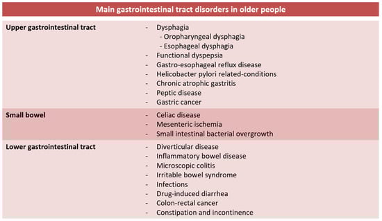 Figure 2 summarizes the main GI tract disorders in older people, divided according to upper GI tract, small bowel, and lower GI tract involvement.