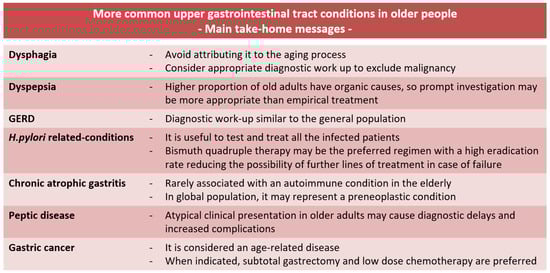 The main take-home messages relative to the abovementioned upper gastrointestinal tract conditions in older people are summarized in Figure 3.