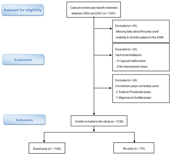 Study cohort: A total of 1347 medical records were identified on the PillCam SB3 software database. A total of 111 records were excluded from the study due to missing data regarding the preparation used, incomplete prep protocols, technical malfunctions, or the utilization of uncommon preparations that are not within the scope of this study (Figure 1). Consequently, the final study group consisted of 1236 adult subjects.