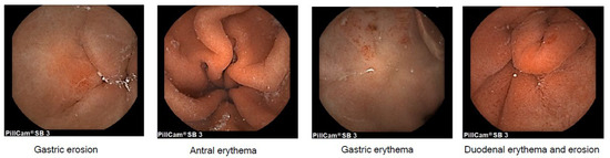 - Fernández, J.F.J.; Sainz, I.F.-U.; Ollo, B.Z.; Dueñas, C.S.; Guimera, M.M.; González, A.E.; Costas, J.J.V. Gastroduodenal lesions detected during small bowel capsule endoscopy: Incidence, diagnostic and therapeutic impact. Rev. Esp. Enferm. Dig. 2018, 110, 102–108. [Google Scholar] [CrossRef]