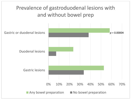 While the percentages of lesions were very similar to the overall data (Table 3), statistical significance was somewhat attenuated due to the smaller sample size. Nevertheless, the statistical significance persisted for gastroduodenal lesions in both (OSS) and (bis) groups, as well as for duodenal lesions in the (OSS) group, and gastric lesions in the (bis) group. The patients with no prep had gastroduodenal findings in 35% of the cases, compared to 58% in the (OSS) group (RR 1.68, p = 0.03) and 78% in the (bis) group (RR 2.25, p = 0.003).