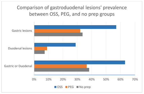 Comparison of the gastroduodenal lesion prevalence between OSS, PEG, and no prep groups.