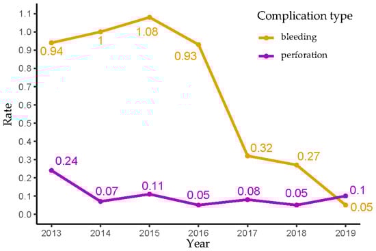 Our study recorded a substantial decline in bleeding rates, with a range of 0.93% to 1.08% before 2017, decreasing to around 0.3 during 2017–2018, and further declining to 0.05 in 2019. Meanwhile, perforation rates remained consistent at 0.05% to 0.11% between 2014 and 2019. These figures were in line with documented rates of colonoscopy-related bleeding and perforation in the existing literature. Prior studies have reported a broad spectrum of overall bleeding complication rates for all colonoscopy indications, ranging from 0.04% to 6.1% [,,,,,,,,,,,]. Specifically, bleeding complication rates for screening/surveillance colonoscopies without polypectomy have been reported within the range of 0.21%–0.37% [,,]. Conversely, colonoscopies with polypectomy carry a heightened risk, with bleeding complication rates ranging from 0.7% to 1.5% [,,,,].