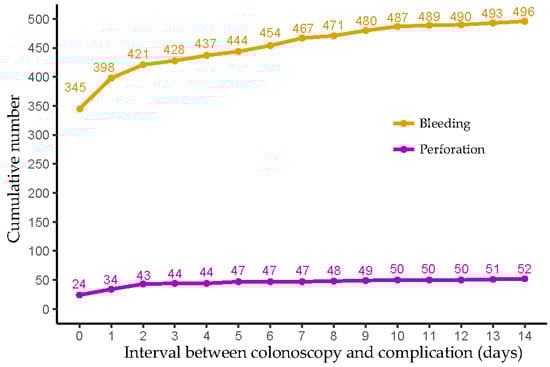The cumulative number of bleeding and perforation events based on the time interval between index colonoscopy and complication occurrence.