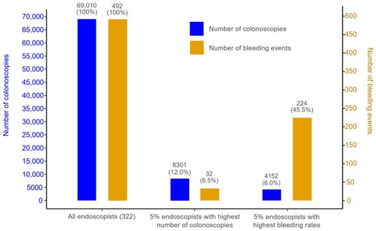 Number of colonoscopies (proportion) and number of bleeding events (proportion) of three groups: (1) all endoscopists with a minimum of 20 colonoscopies (total 332 endoscopists); (2) the top 5% of endoscopists with the highest number of colonoscopies; and (3) the top 5% of endoscopists with the highest bleeding rates.