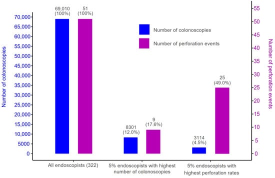 Number of colonoscopies (proportion) and number of perforation events (proportion) of three groups: (1) all endoscopists with a minimum of 20 colonoscopies (total 332 endoscopists); (2) the top 5% of endoscopists with the highest number of colonoscopies; and (3) the top 5% of endoscopists with the highest perforation rates.