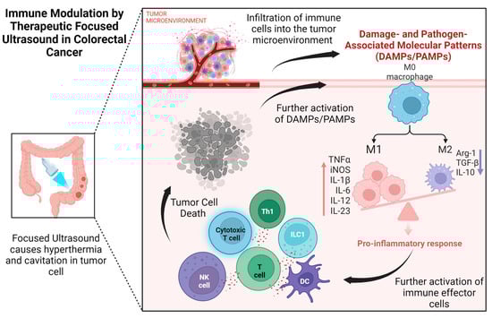 Immune modulation by therapeutic focused ultrasound in colorectal cancer. The high-intensity beam from HIFU targets tumor cells of colorectal cancer, disrupting the tumor microenvironment and triggering a cascade of events. As cavitation and hyperthermia cause damage to tissue cells, it attracts damage- and pathogen-associated molecular patterns (DAMPs/PAMPs). DAMPs/PAMPs activate the undifferentiated macrophages (M0) to characterize into pro-inflammatory macrophages (M1) and anti-inflammatory macrophages (M2). Because of DAMPs/PAMPs, M1 plays a significant and dominant role compared to M2. This pro-inflammatory response of M1 catalyzes the transport of cytotoxic T cells, Th1, ILC1, NK cells, and DC to the targeted tumor tissue causing necrosis and cell death. These dead cells again send signals in the form of DAMPs/PAMPs, and the pro-inflammatory response continues until the tumor and dead cells are wiped out. Black arrows show the event step by step, purple arrow: Decreased expression of Arg-1, TGF- β and IL-10, Orange arrow: Increased expression of TNF α, iNOS, IL-1 β, IL-6, IL-12. IL-23. Arg-1: Arginase-1; DAMPs: damage-associated molecular patterns; DC: dendritic cell IL: Interleukin; ILC1: innate lymphoid cell; iNOS: inducible nitric oxide synthesis; M0: non-activated macrophage; M1: pro-inflammatory macrophage; M2: anti-inflammatory macrophage; NK cell: natural killer cell; PAMPs: pathogen-associated molecular patterns; TGF-β: Tumor Growth Factor-β; Th1: type 1 T-helper; TNF-α: tumor necrosis factor-alpha.