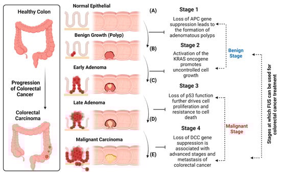 Schematic representation of progression of colorectal tumors. (A): APC genes of normal healthy intestinal cells are suppressed that lead to initiation of events for the formation of adenomatous polyps. (B): Adenomatous polyps started growing in the intestinal line but these polyps are still benign (C): Polyps becoming malignant, KRAS oncogene of these adenomatous polyps leads to the uncontrolled cell growth, forming early adenoma (D) Polyps are now in malignant stage, p53 genes are lost that accelerates cell proliferation and resist cell death, forming late adenoma (E): DCC genes are lost in the advanced stages and the polyp is now metastasized. Colorectal carcinoma is now malignant. Once a tumor, whether benign or malignant, is diagnosed, FUS could be used for the treatment of colorectal cancer.