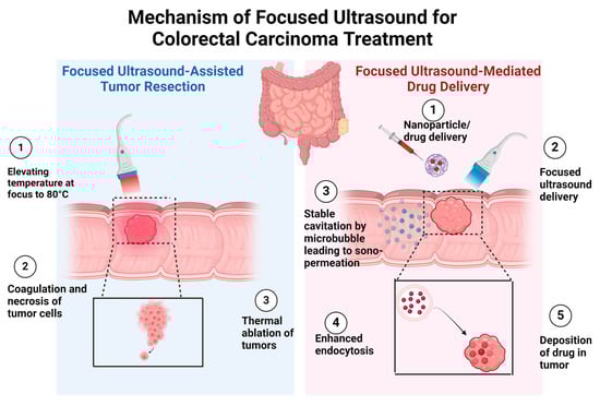 FUS presents specific applications in the treatment of colorectal cancer, including precise targeting and the delivery of therapeutic agents to primary tumors in the colon or rectum [85]. This targeted approach allows for localized treatment, minimizing harm to surrounding healthy tissue, thereby reducing side effects while simultaneously enhancing the effectiveness of the treatment [63]. Additionally, in the case of metastatic colorectal cancer, focused ultrasound offers a non-invasive option to target and treat metastatic lesions. This intervention can slow disease progression and enhance patient survival [86]. Moreover, FUS can strengthen the efficacy of chemotherapy by improving drug delivery to tumor sites. This optimization could potentially allow for the administration of lower drug doses or reduction in treatment frequency, ultimately improving patient outcomes and ensuring a better quality of life [19].