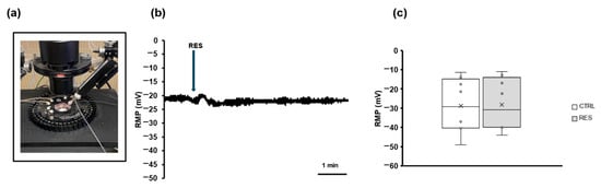 Effect of RES on SMC resting membrane potential (RMP). (a) Detail of the experimental recording chamber. (b) Representative example of RMP tracings (in mV) evoked from a gastric fundus SMC before and after the addition of RES (100 ng/mL), indicated by the arrow; (c) RMP values (in mV) from untreated cells (CTRL, n = 8) and after RES addition (RES, n = 8). Data values represented as mean ± SD are listed in Table 1. p > 0.05 vs. CTRL (Student’s t test, p = 0.41).