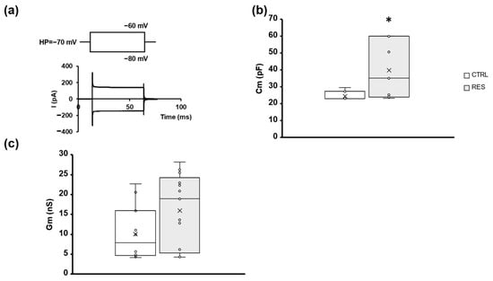 Effect of RES (100 ng/mL) on SMC membrane passive properties: (a) voltage–clamp protocol used for evaluation of membrane’s passive properties, consisting of a ±10 mV voltage pulse, applied from a holding potential (HP) = −70 mV (top) and representative current response (pA) (bottom); (b) membrane capacitance, Cm (pF); (c) membrane conductance, Gm (nS). * p < 0.05 vs. CTRL (Student’s t test). Parameter values as mean ± SD are listed in Table 1.