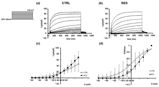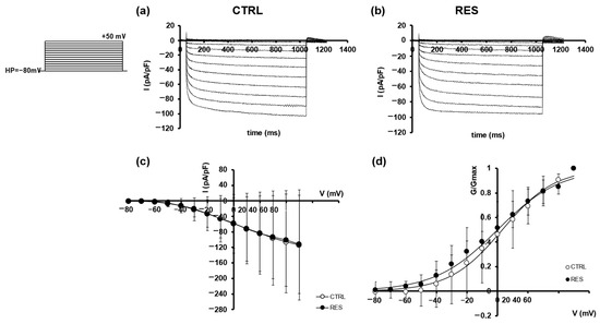 Effects of RES on outward K+ currents evoked from murine gastric fundus SMCs. Representative tracings of outward ion currents (in pA/pF) (voltage–clamp step pulse protocol in the inset) recorded from a gastric fundus SMC before (a) and after the addition of RES (100 ng/mL) (b) to the bath medium. (c) I-V plot (in pA/pF) reporting the mean outward currents related to all the experiments carried out as a function of the voltage step applied (CTRL: open circles; RES: filled circles). (d) Normalized conductances fitted with the Boltzmann function: G/Gmax = 1 − 1/{1 + e[(Vm − V0.5)/k]} (superimposed smooth lines). Boltzmann parameters are listed in Table 2. Data are expressed as mean ± SD (n = 3). p > 0.05 vs. CTRL (Student’s t test). The current traces displayed in (a,b) are recorded from the same SMC.