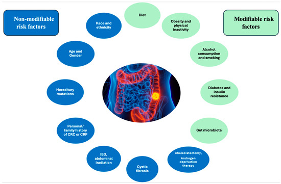 The risk factors for CRC are categorized into two main groups: non-modifiable and modifiable factors (Figure 1) [6,14].