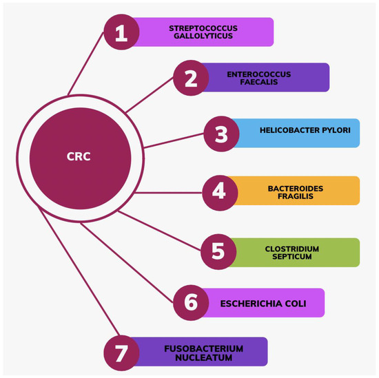 The intestinal microbiome plays a role in colorectal oncogenesis through direct interaction with enterocytes, as well as involvement in cellular metabolism and immune response processes [37]. Sequencing-based investigations have revealed alterations in the intestinal microbiota composition and a reduction in its diversity within patients diagnosed with CRC [37]. It has been reported that several species promote colorectal carcinogenesis, including Streptococcus gallolyticus, Enterococcus faecalis, Helicobacter pylori, Bacteroides fragilis, Clostridium septicum, Escherichia coli, and Fusobacterium nucleatum (Figure 2) [38].