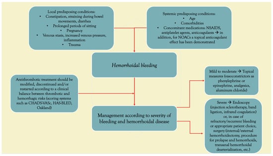 Hemorrhoidal bleeding: schematic illustration of risk factors and management.