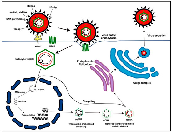 Hepatitis B virus (HBV) belongs to the Hepadnaviridae family of small, enveloped, primarily hepatotropic DNA viruses. HBV integrates itself into the human host genome. It is transmitted parenterally via contaminated blood and bodily fluids [8]. Patients unable to clear the virus can develop Chronic Hepatitis B (CHB) [8]. The lifecycle of HBV, as depicted in Figure 1, offers many targets for antiviral therapies.