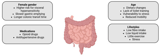 - Verkuijl, S.J.; Meinds, R.J.; Trzpis, M.; Broens, P.M.A. The influence of demographic characteristics on constipation symptoms: A detailed overview. BMC Gastroenterol. 2020, 20, 168. [Google Scholar] [CrossRef] [PubMed] [PubMed Central]