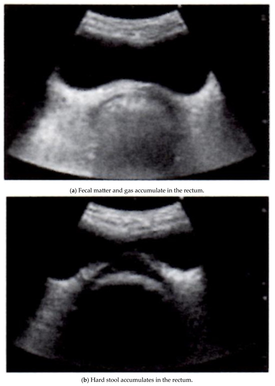 Evaluation of fecal retention in the rectum using ultrasound imaging equipment (this image is from [36] with some modifications): (a) fecal matter and gas accumulate in the rectum. The presence or absence of rectal fecal retention and the quality of the stool can be evaluated by recording a cross-sectional image of the rectum via ultrasound. In cases of fecal accumulation in the rectal lumen, echoes are reflected from the surface of the content located deeper than the bladder, and a half-moon-shaped hyperechoic area is visualized on a cross-sectional image. (b) Hard stool accumulates in the rectum. When hard stool accumulates, acoustic shadows (most of the ultrasound waves are reflected by strong reflectors) do not reach the distal side of the body. As a result, there is no sound behind the reflector. A crescent-shaped hyperechoic area is visualized in which echo or hypoechoic activity is observed. (c) There is no retention of feces in the rectum. When the rectum was free of stool or gas, no obvious hyperechoic area was visualized. On cross-echo images, a circumferential hypoechoic area may be observed as an empty intestinal tract.
