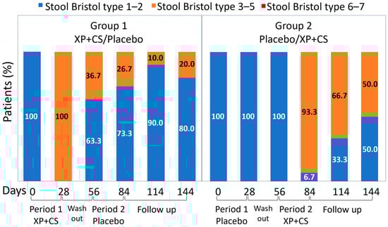 All 60 patients reported constipation at baseline, as assessed by the Bristol Stool Form Scale (BSFS) (Figure 1). Overall, XP + CS was superior to the placebo in resolving constipation. At day 28 (Period 1), all patients in group 1 reported a score of 3–5 (normal stools), whereas all patients in Group 2 reported a score of 1–2 (constipation). Furthermore, patients treated with XP + CS showed significant improvements in stool consistency compared to the placebo at both day 15 (p = 0.04) and 28 (p < 0.001). The remission rate in Group 1 was 46.7% at day 15 and 100% at day 28, compared to 16.7% and 0%, respectively, in Group 2 (Figure 1 and Supplementary Figure S1). Similar trends were observed in Period 2, with a statistically significant difference in stool consistency between groups at day 84 (p < 0.001), further demonstrating the superior efficacy of XP + CS. Notably, no patient reported a Bristol score of 6–7 (diarrhea) at any timepoint. Full data and statistics are provided in Supplementary Table S1.