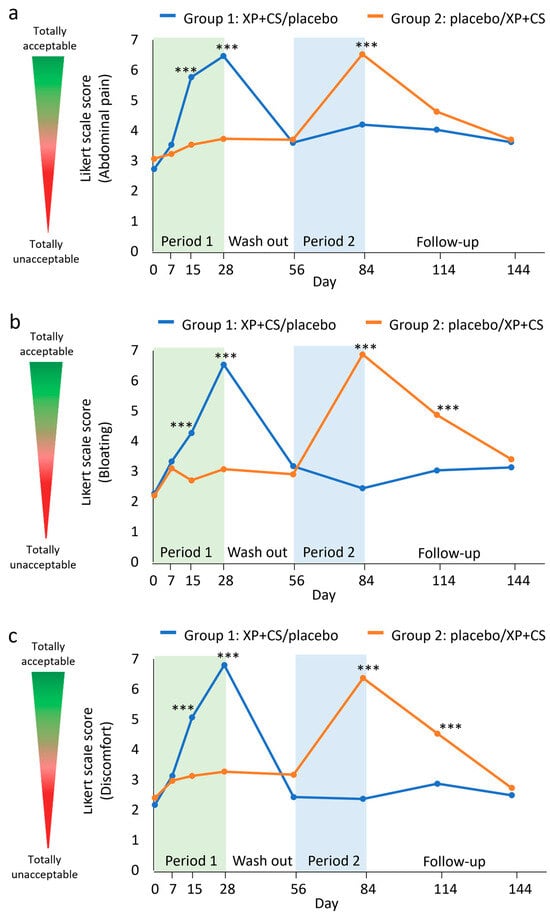 Improvement in IBS symptoms assessed using a 7-point Likert scale (1 = totally unacceptable; 7 = perfectly acceptable). XP + CS treatment significantly reduced abdominal pain (a), bloating (b), and discomfort (c) in IBS-C patients. *** p < 0.001 vs. alternative arm.