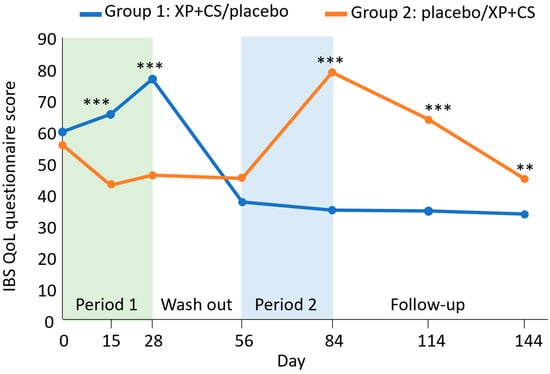 Quality of life (QoL) in IBS-C patients. Treatment with XP + CS significantly improved QoL of IBS-C patients. *** p < 0.001 and ** p < 0.01 vs. alternative arm.