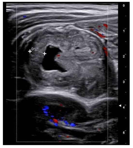 Case 1—US showing the thickened wall of the suspected Meckel’s diverticulum.