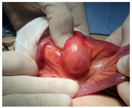 - Locatelli, A.; Dell’Oro, M.G. An uncommon location of a Meckel’s diverticulum mimicking small intestinal duplication cyst. Chirurgia 2020, 33, 332–335. [Google Scholar] [CrossRef]