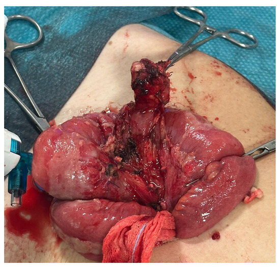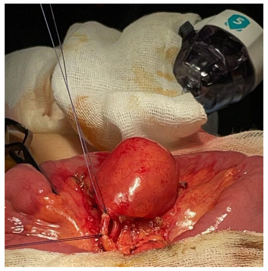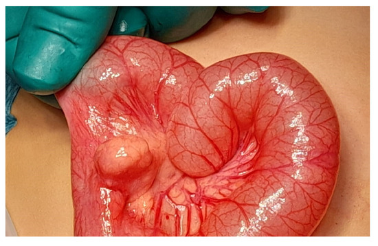 An upper and lower endoscopy revealed residual blood without active bleeding, leading to a suspicion of a bleeding MD (Figure 5). Laparoscopic exploration confirmed the suspected diagnosis, revealing a diverticulum located on the mesenteric border approximately 70 cm from the ileocecal valve. The ileal segment was exteriorized through the umbilical access (Figure 6), and a segmental resection including the diverticulum was performed, followed by an end-to-end ileo–ileal anastomosis. Postoperative recovery was uneventful, and the patient was discharged after 10 days. Histological examination confirmed the diagnosis of MMD.
